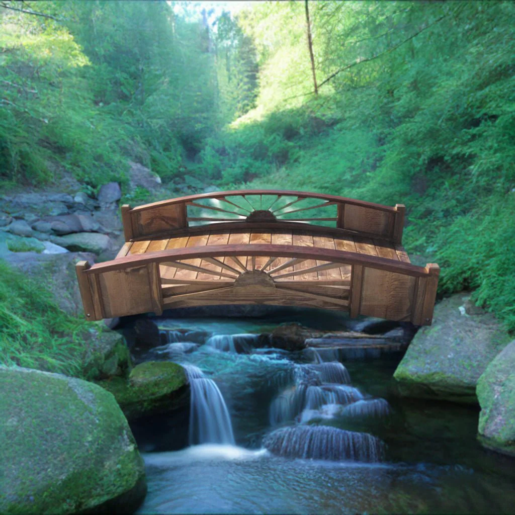 Transform your outdoor space with this Sunburst backyard bridge featuring distinctive sunburst arched railings. This gracefully arched wooden backyard bridge blends seamlessly into any landscape theme, highlighting your water features and rock gardens while adding a spirit-nurturing Zen aspect to your garden. Handcrafted in the USA from premium North American Douglas Fir and clear Pine, this bridge combines elegant aesthetics with exceptional durability and custom-built quality.