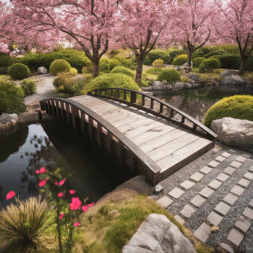 Transform your outdoor space with this Japanese garden bridge featuring elegantly arched crescent-shaped rails that blend seamlessly into any landscape theme. Perfect for highlighting your water features, creeks, or rock gardens, this bridge creates a stunning focal point with its distinctive curved railings. Handcrafted in the USA from premium North American Douglas Fir and Pine, this bridge combines elegant aesthetics with exceptional durability and is available in two widths to suit your needs.